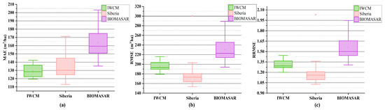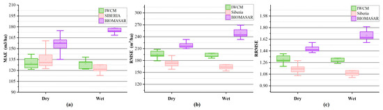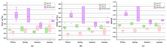 The effect of season on the results. (a) MAE distribution, (b) RMSE distribution, (c) RRMSE distribution. There was precipitation on the spring date of the BIOMASAR model, and the distribution span was large. The IWCM model was stable. The result of the Siberia model was the best in winter.