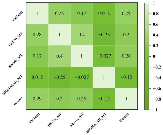 The correlation between multiple time series and the measured GSV data from the NFI were calculated. Figure 6 represents the 2010 dataset. It can be seen that the correlation between the IWCM and GSV data from the NFI was higher than that of the other two models, and the correlation of BIOMASAR was lower than that of the other results. The lower accuracy of BIOMASAR is directly due to the model using existing data parameters. As mentioned in [33,34], the parameters can be directly used.