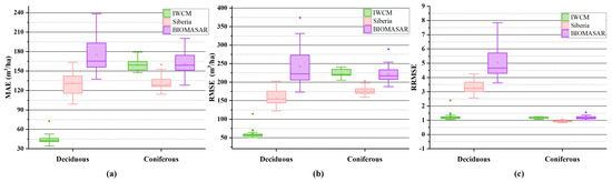 The effect of tree species on results. (a) MAE distribution, (b) RMSE distribution, (c) RRMSE distribution. The IWCM model was the most sensitive to tree species, and the accuracy for deciduous forest was higher than that for coniferous forest.
