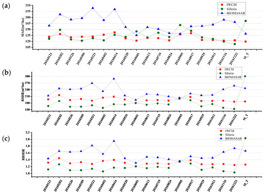 The multi-time-series results synthesized by weighting and superimposing the single-date results of the model are shown in Table 1. The average absolute error, root mean square error, and relative root mean square error of the IWCM model were better, followed by those of BIOMASAR and Siberia.