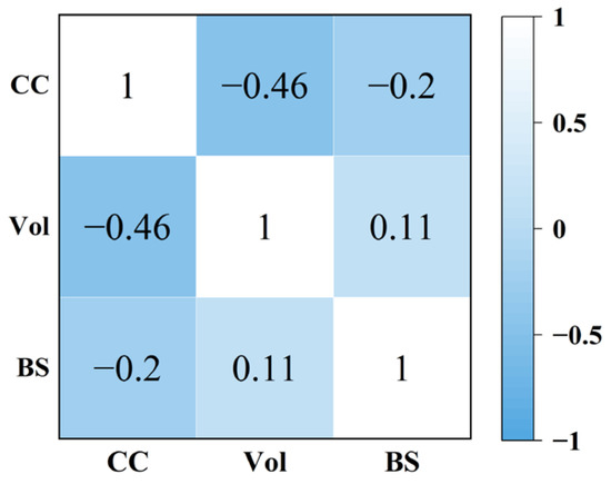 Vol is the measured GSV, CC represents coherence, BS represents backscattering, and the value on the graph represents the correlation coefficient. From the second column or row the correlation between GSV and coherence or backscattering can be obtained.
