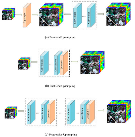 Front-end Upsampling. Learning the mapping from LR images to HR images directly is not an easy task. In contrast, more researchers prefer to first scale up the LR images and then optimize the scaled-up images using deep neural networks, as shown in Figure 3a. The front-end upsampling strategy was first used in the field of natural image SR. Dong, et al. [14] used bicubic interpolation to first scale the LR image to the desired size and proposed the SRCNN model used to learn the mapping relationship between the interpolated image and the labeled HR image. The 3D-FCNN model for HSI SR proposed by Mei, et al. [18] also utilizes the idea of upsampling at the front end. In general, the most difficult upsampling step is carried out using traditional methods such as bicubic interpolation, and deep neural networks only need to refine these interpolated images to reconstruct high-quality details. This strategy greatly reduces the difficulty of training neural networks, and front-end upsampling has become one of the most mainstream frameworks [56,57]. However, two problems brought by front-end upsampling cannot be ignored. On the one hand, the noise in LR images will be scaled up with the upsampling layer, which leads to undesirable reconstruction results. On the other hand, after scaling up the images, most of the computations are performed in the high-dimensional space, which will bring high computational cost and time cost.