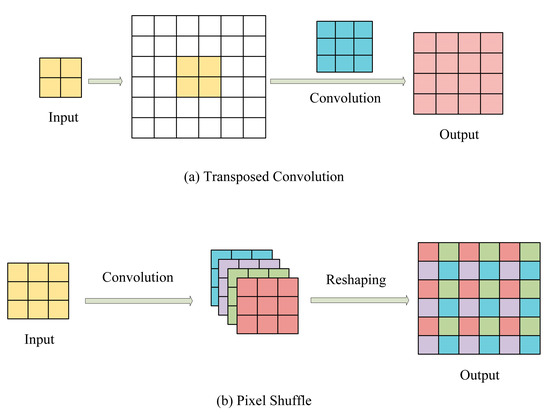 Transposed Convolution. Transposed convolution, also known as deconvolution, was first applied to solve the SR task in the FSRCNN [58] model. It is worth noting that transposed convolution is not the inverse operation of regular convolution, but exists as a special type of convolution. Specifically, transposed convolution first increases the size of the input image by zero padding, and then performs the convolution operation on the padded image to achieve the purpose of increasing the image resolution. As shown in Figure 4a, suppose the input image is a size, and we want to use a size convolution kernel to change the image resolution to twice the original one, i.e., to obtain a size output image. First, we zero-fill the original image to make it , and then use the convolution kernel to perform convolution on the image to obtain a output, which completes the process of twice upsampling. The above example is with and . Other parameters can be set to achieve different padding and magnification. Transposed convolution makes the upsampling process more flexible by continuously refining the image magnification operation in a learnable way. Transposed convolution is also the most popular upsampling method among the back-end upsampling structures.