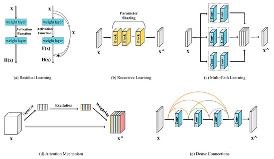It has become a consensus in the field of deep learning that network design can significantly impact the capabilities of a model. In the field of HSI SR, researchers have employed various network design strategies to build complete networks based on the three upsampling frameworks described above. In this section, we introduce each of the commonly used network structures and analyze their advantages and limitations. The structures of these networks are shown in Figure 5.