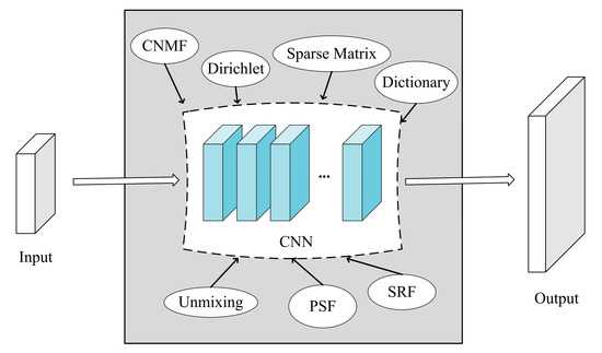 Yokoya, et al. [40] proposed the well-known coupled non-negative matrix factorization (CNMF) algorithm based on a linear spectral mixing model. It reconstructs fused images with high spatial and spectral resolution by fusing low spatial resolution HSI and high spatial resolution MSI with the structure in Figure 2. The hyperspectral and multispectral data are alternately decomposed into an end element matrix and an abundance matrix by the CNMF algorithm, while the sensor observation model is considered in the initialization matrix. Benefiting from its simple update rules, this method is extremely easy to implement. However, the multiple iterations in the unmixing process make the CNMF algorithm very computationally expensive. In 2014, Bendoumi, et al. [41] proposed a new fusion framework. The authors divided the image into multiple sub-images and applied a fusion procedure to each sub-image, which further improved the performance of the proposed SMA-based fusion algorithm.