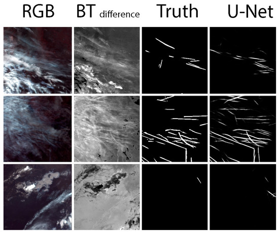 Randomly selected example imagery of three examples from the validation data set. From left to right: the RGB imagery (red = 8 μm, green = 11 μm, blue = 12 μm) ABI imagery for reference; the “BT difference” column showing the 12 µm minus 11 µm brightness temperature difference; the “Truth” or validation masks; and the U-Net image segmentation results.