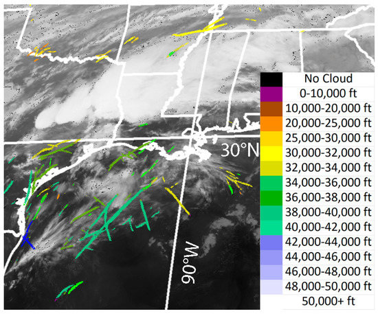 An advantage of using thermal IR bands on ABI is that the technique can be applied day or night. The main advantage of using the GOES ABI is that it provides nearly complete coverage over the Western hemisphere every 10 min at a nominal 2 km resolution. An example image of contrail detection over the Gulf of Mexico in GOES imagery is shown in Figure 3. In this example, contrail detections are overlaid on an image of the 11 µm brightness temperature image from 0420 UTC (or 10:20 PM local time) on 10 March 2023. The contrails are color-coded by the GOES ABI Cloud Top Height (ACHA) product [19]. At that time, the native ACHA product had a 4 km nominal resolution, so the product is interpolated to match the 2 km resolution of the native ABI brightness temperature imagery. Later in March of 2023, a 2 km resolution ABI Cloud Top Height product became operational [19] to match the 2 km resolution of the imagery so that interpolation will not be needed in future work. Additionally, the ACHA height is given in km; for aviation applications, it is converted to feet, and for each contrail, the height reported is the highest height retrieval within each contrail object.
