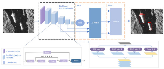 With the rapid development of the computer technology, deep learning has been widely applied in various fields [20,21,22]. In the field of object detection, deep learning-based object detection models automatically extract the features of targets through convolutional neural networks, reducing human involvement and making the extracted target features more accurate [23]. Especially in some complex background Synthetic Aperture Radar (SAR) images, deep learning-based object detection algorithms can effectively extract and recognize targets in images compared to traditional object detection algorithms [24]. Object detection algorithms based on deep learning can be divided into one-stage and two-stage object detection algorithms according to whether region proposals are executed on feature maps. R-CNN, Fast R-CNN, and Faster R-CNN are typical one-stage object detection algorithms which have high detection accuracy but require large computing power and long model inference time [25,26,27]. One-stage object detection algorithms include You Only Look Once (YOLO), Single Shot Multibox Detector (SSD), etc. Compared to two-stage object detection algorithms, one-stage object detection algorithms have a faster inference speed. However, the lack of a region proposal step in one-stage algorithms results in a loss of accuracy [28,29,30,31]. Hu et al. [32] proposed the Squeeze-and-Excitation (SE) block, which first introduced attention mechanism into the field of object recognition. SE weights the channels of the convolutional neural network, enabling the network to focus more on important channel features. Woo et al. [33] proposed the Convolutional Block Attention Module (CBAM), which suppresses non-object features in the image by combining channel attention mechanism with a spatial attention mechanism. Wang et al. [34] suggested that feature weights could be generated more efficiently by selecting an appropriate number of adjacent channels. Lin et al. [35] proposed that shallow features have better positional information and deep features have better semantic information in convolutional neural networks. To address this, they proposed Feature Pyramid Network (FPN) for fusing shallow and deep features. To better balance semantic and positional information, Wang et al. [36] constructed the Path Aggregation Network (PANet) by adding a top-down feature fusion path to FPN. Residual structures are also a way to optimize the expressive power of Convolutional Neural Network (CNN). For example, Bochkovskiy et al. [37] designed Cross Stage Partial Darknet53 (CSPDarknet53) as the backbone structure for object detection networks. CSPDarknet53 effectively alleviates the loss of small object information by introducing residual connections. In addition, they also added spatial pyramid pooling (SPP) to enhance the network’s ability to detect multi-scale objects. Li et al. [38] used residual structures to preserve more object information in the deep network of DetNet. Chen et al. [39] proposed the Atrous Spatial Pyramid Pooling (ASPP), which replaces the pooling operation in SPP with dilated convolution to reduce the loss of object information.