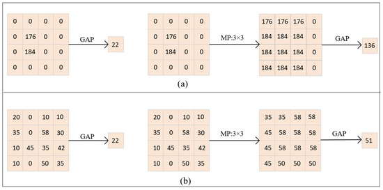 Background information suppression principle. (a) The effect of two different information integration methods in channels containing only ship features. (b) The effect of two different information integration methods in channels containing only background features. GAP: global average pooling, MP3 × 3: maximum pooling with a 3 × 3 core.