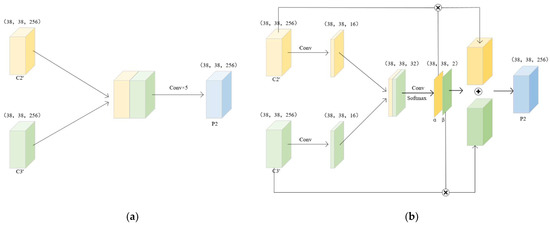 The overall workflow of AFBM is shown in Figure 5b, which can be divided into two stages: the first stage generates fusion weights α and β, while the second stage generates the fused output feature. In the first stage, the channel numbers of the two features to be fused (C2′ and C3′) are adjusted to 16 using a 1 × 1 convolution. Then, the two features with adjusted channel numbers are superimposed. Further, the relationship between the channel of the superimposed feature is established through convolution, and the channel number is adjusted to 2. Finally, the function Softmax function is used to generate the fusion weights α and β from the two channels. The generation of output feature P2 in the second stage is as follows: