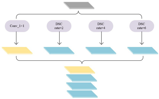 Detection capabilities of SAR ship detection models should consider variable ship sizes. To enhance the multi-scale ship detection capability of the ship detection model while reducing the loss of feature information, we introduce the ASPP module, as shown in Figure 6. The module has four parallel branches. The four branches contain three atrous convolutions with different dilation rates (rate = 2, 4, 6) and one regular convolution (kernel size = 1). Compared with pooling, atrous convolution has less information loss while obtaining different receptive field information. We apply this with normal convolutions to further integrate the semantic information of the input features. Finally, to make the output features retain as much receptive field information as possible, we further stack the output features of the four branches.