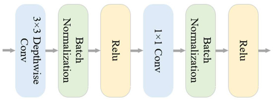 The introduction of parallel convolutional layers in the ASPP module increases the number of network parameters; therefore, to reduce the number of parameters, we introduce a Depthwise Separable Convolution (DSC) to decode ship location (Figure 7). DSC divides the traditional convolution process into regional convolution and inter-channel convolution. The regional convolution extracts the features of each channel of the feature layer, and the inter-channel convolution uses a 1 × 1 convolution kernel to integrate these feature channels. The Batch Normalization prevent the ship detection model from overfitting. The activation function increases the nonlinear expression ability of convolutional neural network.
