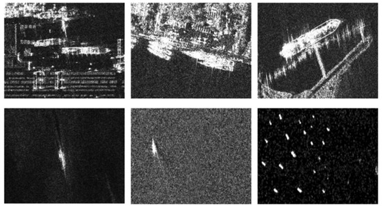 In recent years, HRSID has also been frequently used to evaluate the performance of ship detection models in SAR ship detection field. HRSID is constructed using synthetic aperture radar with Sentinel-1 and TerraSAR-X, and includes three polarizations: HH, HV, and VV. HRSID contains a total of 5604 SAR images and 16,951 ships, and the images in the dataset are cropped to 800 × 800 pixels, which is more convenient for model training. In addition, compared to SSDD, HRSID contains more data, which can lead to better training of deep learning-based ship detection models. Some SAR images from HRSID are shown in Figure 9.