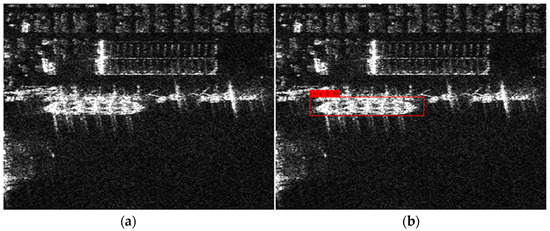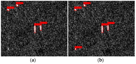 To illustrate the effectiveness of PPAM more intuitively, a visual comparison of the detection results is shown in Figure 10. The image in Figure 10 contains a large amount of noise, which leads to a smaller difference between ships and the surrounding background, affecting the feature extraction capability of the backbone of the ship detection model. As shown in Figure 10a, there are missed detections when using the baseline to detect ships, while the model with PPAM added in the baseline correctly detects the ship target, as shown in Figure 10b. This result further demonstrates the effectiveness of PPAM.