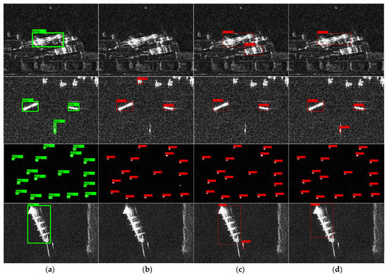 Ship detection results of different methods. (a) The real position of the ship in the SAR image. (b) Ship detection effect of HR-SDNet in SAR image. (c) Ship detection effect of YOLO V5 in SAR image. (d) Ship detection effect of PPA-Net in SAR image.