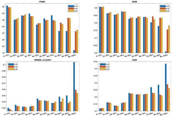 To further understand the benefit of conditional inference strategy, Table 3 reports the performance of SeqDMs as a function of cloud coverage, inferred with input sequences of length . The cloud coverage is calculated by averaging the extent of clouds of each images in the sequence of length . The results show that longer input sequences can significantly improve the performance, especially in the cases of extreme cloud coverage. Figure 4 shows the performance histograms of SeqDMs in terms of PSNR, SSIM, NRMSE(cloudy), and SAM; it visualizes the significant improvements in the extreme cloud coverage cases by increasing input sequences length L. In addition, the cloud-removal performance is highly dependent on the percentage of the cloud coverage. While the performance decrease is not strictly monotonous with an increase in cloud coverage, a strong association still persists.