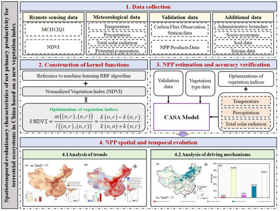 The technical route for this study encompassed the four main aspects illustrated in Figure 3: (1) Data Acquisition, which involves obtaining remote-sensing data, meteorological data, validation data, and other relevant data sources; (2) Construction of the kernel function by referencing the RBF algorithm in machine learning to optimize the normalized vegetation index NDVI; (3) Estimation and Accuracy Validation of the net primary productivity (NPP) utilizing the CASA model to estimate vegetation NPP in Chinese terrestrial ecosystems in the past two decades and validating the results using the validation data; and (4) Analysis of the spatiotemporal evolution of NPP, including trend analysis and examination of the driving mechanisms.