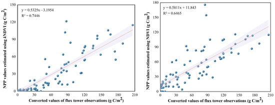 The study results show that the simulated NPP values based on the CASA model are strongly correlated with the measured values at the stations (R2 > 0.6) (Figure 4). Interestingly, the NPP estimated with kNDVI (R2 = 0.74) had a better correlation than that estimated with NDVI (R2 = 0.65). This finding suggests that the NPP values estimated using kNDVI were more accurate than those obtained using NDVI. Compared with NDVI, the NPP values estimated based on kNDVI were closer to the measured NPP values in both densely vegetated and sparsely vegetated sites (Figure 5), and more closely matched the phenological cycle measured at the flux stations, making this approach more suitable for estimating terrestrial vegetation NPP on a national scale.