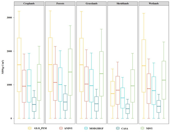 The comparison revealed that the mean values of the three NPP products and NPP estimated by this study varied (Figure 6), with GLO-PEM NPP (1431.95 g C/m2) > NDVI NPP (1161.43 g C/m2) > kNDVI NPP (942.46 g C/m2) > MOD17A3HGF NPP (864.17 g C/m2) > Chinanpp NPP (397.33 g C/m2). The authors of [39] demonstrated that the NPP values estimated by the GLO-PEM model were generally higher than the MOD17A3HGF product NPP values and [40] produced the Chinanpp dataset, with the maximum light energy utilization determined as 0.55, while the maximum light energy utilization estimated by the other two products and in this study was defined according to each vegetation type (Table 1); thus, the NPP values of Chinanpp products were low. The NPP mean estimated by NDVI in this study was high compared with the NPP mean of the MOD17A3HGF product, which was overestimated, while the NPP mean estimated by kNDVI was close to the NPP mean of MOD17A3HGF, and both of them were in better concordance. Generally, the NPP values estimated using kNDVI in this study were reliable and could be used in subsequent analysis.