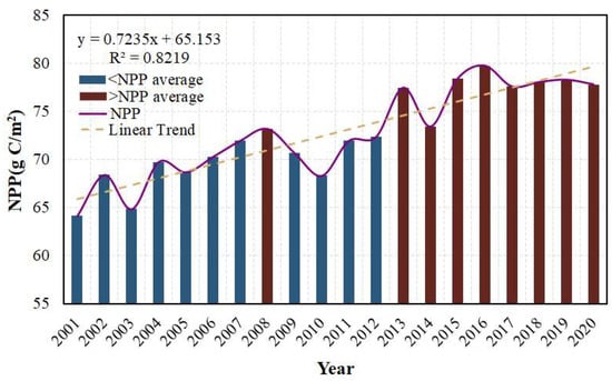 On an interannual scale, the NPP variation within the research area from 2001 to 2020 showed a fluctuating upward trend between 64.13 and 79.72 g C/m2 with a rate of increase of 0.7235 g C/m2 (R2 = 0.82) and a mean value of 72.75 g C/m2 (Figure 7). The trend of NPP changes during the study period was not continuous, with large ups and downs and fluctuating characteristics during 2001–2016 and leveling off during 2017–2020. The maximum value of NPP over the studied period occurred in 2016, exceeding the average by 6.97 g C/m2, while the minimum value of NPP occurred in 2001 and was below the mean value of 8.62 g C/m2.