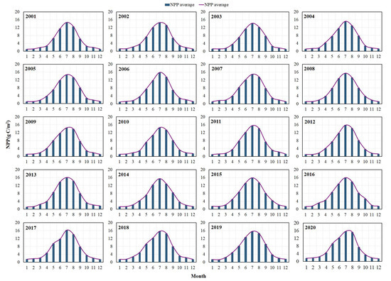 On a monthly scale, the NPP trend line for the study area over the studied period from January to December generally showed an inverted “V” shape (Figure 8), with the NPP peaking in July each year. The monthly variation features of NPP are similar to the climate characteristics, with higher NPP values in summer and lower NPP values in winter. Because the changes in vegetation NPP are influenced by the control of vegetation growing process and light energy utilization, in turn, light energy utilization is affected by different circumstantial factors, which include temperature, precipitation, and solar radiation. The hot and humid environment in summer is suitable for vegetation growth, while the cold and poor rainfall in winter is not conducive to the accumulation of vegetation organic matter.