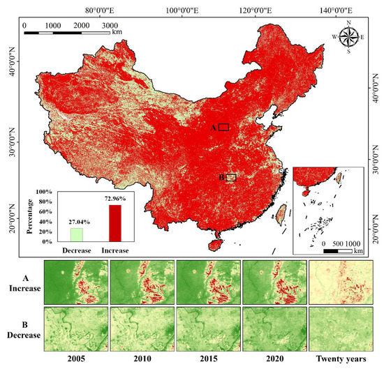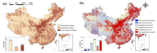 The combination of the Theil–Sen median trend analysis with the Mann–Kendall trend test approach is a valuable method to identify trends in long-term sequence data [32]. This method has become increasingly popular for analyzing long-term vegetation data. For this research, we utilized the Theil–Sen median to examine the trends in vegetation NPP over the past two decades in Chinese terrestrial ecosystems.