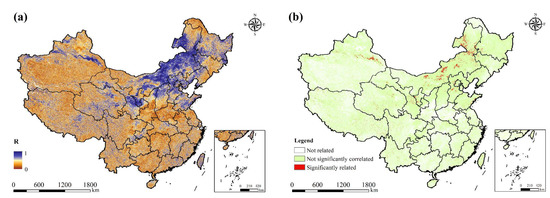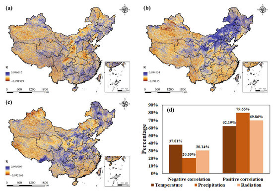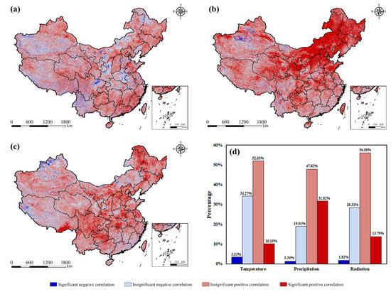 The impacts of temperature, precipitation, and radiation on vegetation NPP were analyzed separately, eliminating the impacts of additional elements. The main positive correlation was among vegetation NPP and temperature, precipitation, and radiation in the research region (Figure 14d). The areas where NPP showed a positive correlation with the temperature accounted for 62.19% of the total, primarily in East China and South China, the southern part of Central China, the eastern and southern parts of North and Northeast China, the northern and eastern parts of Northwest China, and the western and eastern parts of Southwest China (Figure 14a). The areas where NPP was positively correlated with precipitation were as high as 79.65%, mainly in Northeast and North China, the northern part of East China, and the northern and eastern parts of Northwest China (Figure 14b). The precipitation in certain regions was negatively correlated with the NPP process, mainly in southern China, central China, and southern East China. The areas where NPP was positively correlated with solar radiation accounted for 69.86% and were mainly located in North China and Central China, the eastern part of Southwest China, most of Northwest China, North China, and East China (Figure 14c).