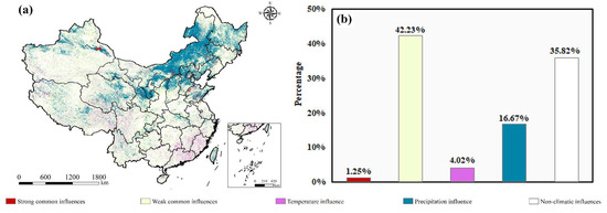 The combined investigation of the impacts of the temperature and precipitation factors on the vegetation NPP demonstrated that the multiple correlation coefficients of temperature, precipitation, and vegetation NPP ranged from 0 to 1 (Figure 16a). The correlation between temperature, precipitation, and vegetation NPP was predominantly non-significant by the F-significance test (Figure 16b). The relative role of temperature and precipitation on NPP was further explored (Figure 17), with climatic factors affecting up to 64.18% of the area. The highest percentage of regions with a weak common influence was 42.23%. This was followed by precipitation and temperature, with 16.67% and 4.02%, respectively. The strong common influence saw the lowest percentage of regions, with only 1.25%.