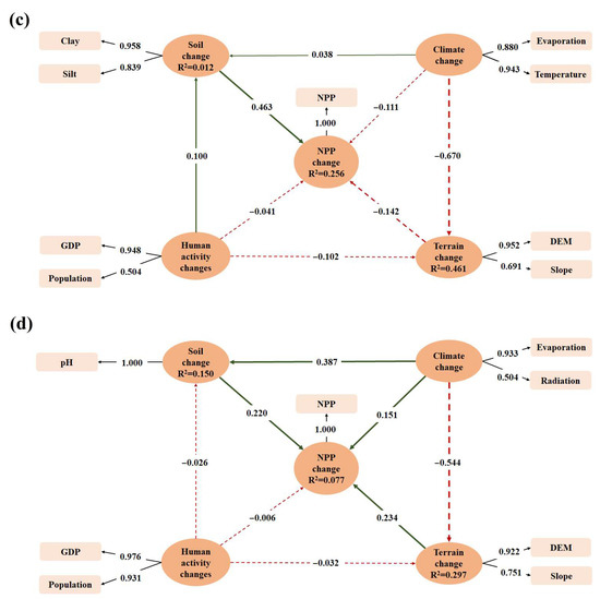 PLS-SEM model plots: (a) 2001–2005, (b) 2005–2010, (c) 2010–2015, and (d) 2015–2020 for the relationship between changes in each variable and changes in NPP. Ovals indicate latent variables, rounded rectangles indicate explicit variables, arrows indicate their association, red dashed lines indicate negative correlations, and green solid lines indicate positive correlations.