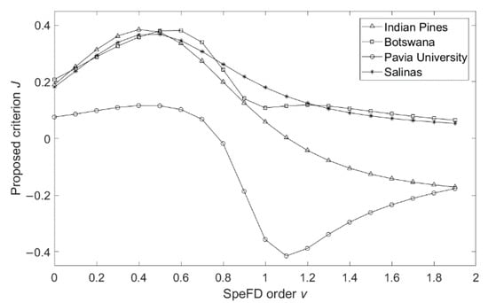 Figure 3 shows that, when the SFD order 0 < v < 1, Botswana, Indian Pines, and Salinas datasets have the same variation trend, they all have obvious peaks as , as the SFD order v increases, the criterion J becomes smaller, which means smaller data separability, this is consistent with the analysis of Figure 1. For the Pavia University dataset, criterion J has an obvious peak as and then decreases with the increase in v, and an inflection point occurs at v = 1.1, but the general trend is still the same as the other three datasets. Therefore, it is confirmed again that the SFD order v ranges between 0 and 1 is more conducive to improving the classification accuracy of HRSIs, and the precise appropriate SFD order range for each dataset is given.