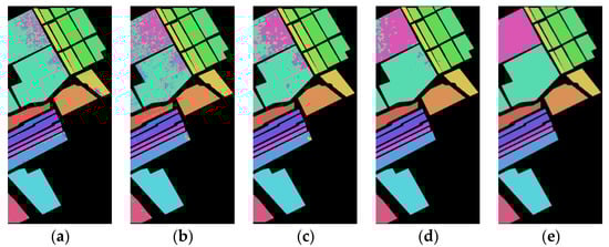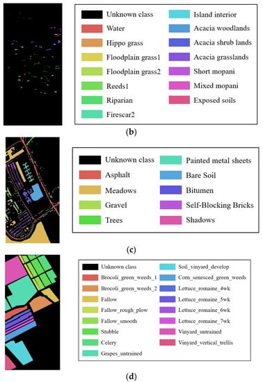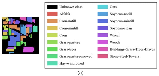 Four real HRSIs, namely, Indian Pines, Botswana, Pavia University, and Salinas, are used for the experiments. The Indian Pines dataset includes 16 classes, and the image size is 145 145, and a total of 10,249 pixels can be used to classify. After removing the bands 104–108, 150–163, and 220 affected by noise factors, 200 bands were finally left for the experiment. The Botswana dataset was obtained by NASA’s EO-1 satellite in the Botswana area. 14 terrain classes are included, and the image size is 1476 256, and 3248 of them are terrain pixels. After removing the bands affected by noise and water vapor, the bands 10–55, 82–97, 102–119, 134–164, and 187–220 were retained, i.e., a total of 145 bands were finally selected. Pavia University dataset contains 9 classes, the image size is 610 340, including 42,776 terrain pixels, and 103 bands were finally selected. The Salinas dataset has 16 classes, and the image size is 512 217. Bands 108–112, 154–167, and 220 were affected by noise and water vapor and were removed. 204 bands are reserved for research, and a total of 54,129 pixels can be used for terrain classification. Table 3 shows the specific sampling results of the experimental data. Figure 4 and Figure 5 show the false-color image and ground truth of these datasets.