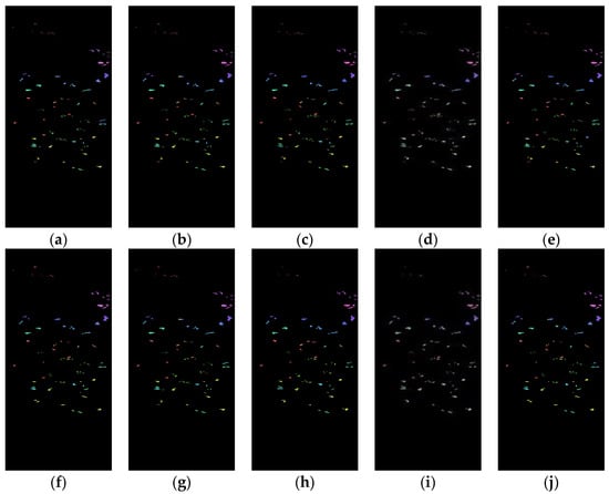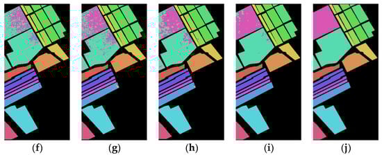 Salinas dataset classification map: (a) Spe feature in FCN model with 88.77% AOA; (b) Spe feature in 1DCNN model with 87.14% AOA; (c) Spe feature in 3DCNN model with 91.02% AOA; (d) Spe feature in 3DCNNPCA model with 97.89% AOA; (e) Spe feature in HybridSN model with 99.78% AOA; (f) SFD feature in FCN model with 90.95% AOA; (g) SFD feature in 1DCNN model with 89.35% AOA; (h) SFD feature in 3DCNN model with 92.98% AOA; (i) SFD feature in 3DCNNPCA model with 98.86% AOA; (j) SFD feature in HybridSN model with 99.94% AOA.