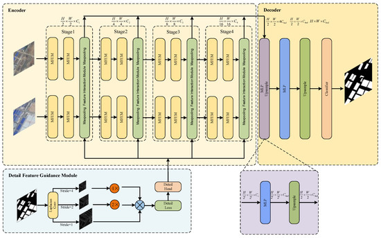 The Multi-Scale Feature Interaction Network (MFIN) proposed in this paper consists of the following aspect: the backbone Multi-Scale Feature Extraction Network (MFEN), which is used to collect multi-scale features from dual-time RS images. The other two auxiliary modules are the Functional Interaction Module (FIM) and the Detailed Functional Guidance Module (DFGM). FIM makes the model pay more attention to the changed parts, and combining the changed parts greatly improves the accuracy. DFGM further guides the model in learning underlying spatial details without increasing computational costs, thereby making the model pay more attention to edge details. An MLP encoder is designed to fuse and decode multi-scale feature information in the decoding section. The framework of the MFIN is shown in Figure 1.