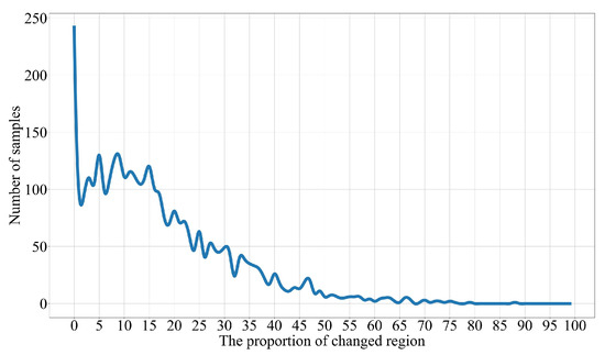 Figure 6 contains many common scenarios in the dataset, such as buildings, roads, and factories. In order to imitate the actual application scenario to a greater extent, we add some additional image pairs in the dataset, such as some images with large shooting angle deviations. Figure 7 shows a statistical analysis of the dataset, in which the change area of most of the sample data is between 5% and 50%. There are 247 samples with a change area ratio of 0–2%. By increasing the imbalance between the samples, the performance of the model can be better tested.