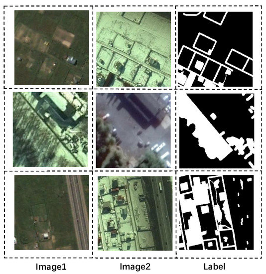 LEVIR-CD is a new large-scale building change detection dataset consisting of 637 pairs of ultra-high-resolution GE images with a size of 1024 × 1024. Its time span is 5–14 years, and it was taken from 2002 to 2018, focusing on significant changes in buildings. The bitemporal remote sensing images in the dataset are taken from 20 different areas in multiple cities in Texas, including villas, high-rise apartments, small garages, large warehouses, and other buildings. Seasonal and light changes are also taken into account to help develop effective algorithms. A schematic diagram is shown in Figure 8.