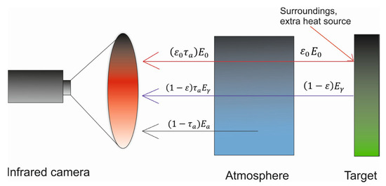 Equation (2) introduces the energy emitted by the atmosphere. This accounts for not only the raw, basic atmosphere but also its shifts over time (daily sun movement). This means images taken on the same day but at different times will be influenced differently by the atmosphere, making the images “look” different and giving different ‘reading’ of the temperature. This needs to be taken into account during the interpretation of data and during planning if the passive method is being used. Equation (3) emphasizes that measured objects are composed of many different emissivity materials. Thus, defining the value of monochromatic emissivity in field conditions is difficult, so the post-processing procedure is required. In addition, Equation (3) introduces both vertical and horizontal viewing angles, so distortions in both directions are different [24,25,41,42]. Experiments also suggest that not only the general environment needs to be taken into account but also the distance to the object and the placement of the IR camera relative to the object [43]. Images taken from the side are influenced differently by the object and environmental emissivity since the energy needs to travel a different distance before it reaches the camera receptor [30,44,45].
