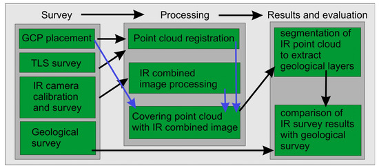 The diagram in Figure 2 shows the workflow used during this study. During the experiment, we performed an onside survey of parts of the longwall excavation front. The survey consisted of a few steps;