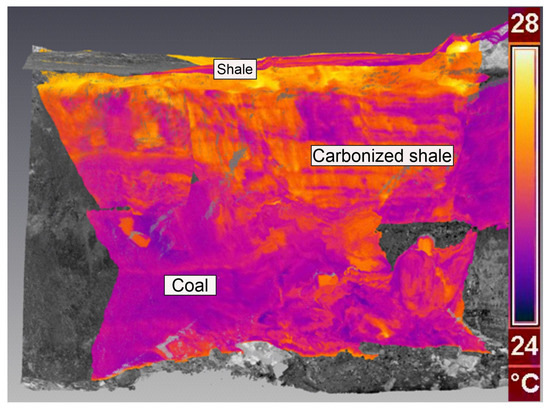 A series of thermograms and photos in the visible spectrum were taken. The accompanying geologist, during the measurement, identified the presence of coal, coal shale, and shale on the longwall. The location of these layers corresponded to the temperature changes on the thermogram. In addition, it turned out that thin intergrowths of shales in the coal were clearly visible. Figure 3 and Figure 4 present a description made by a geologist on a 2-m-long test section of the longwall. Layers of shale, coal, and coal shale are clearly visible on the thermogram but not visible on the point cloud. The geological profile made by the geologist was later used to analyze the quality of the experiment’s results. In total, during the 9-h survey, 11 point clouds, 74 visible light images, and 89 IR images were obtained.
