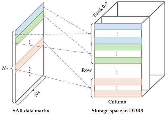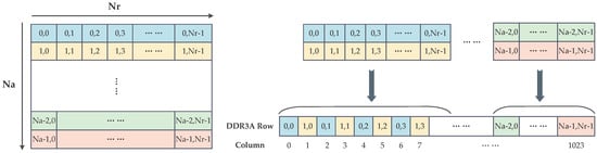 The data on one range or azimuth line must be stored in multiple rows of DDR3 storage cells due to the massive amount of data in the SAR two-dimensional matrix. The burst length in a typical DDR3 storage structure is set to 8 and contains 1024 cells per row. For traditional two-dimensional data access, the data in the range direction only need to be accessed in the order of DDR3 rows, but the data in the azimuth direction can only be accessed through multiple row-crossing. Therefore, the burst transmission for the range access is n . The read and write efficiency of access in the range is calculated using the MT8KTF51264HZ-1G9 memory chip datasheet by converting its above parameters (, , , , and ) into multiples of as follows: