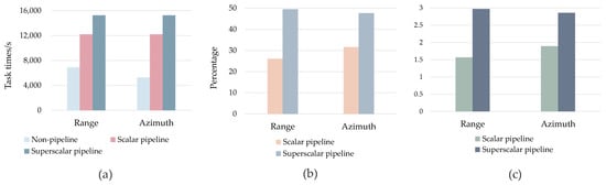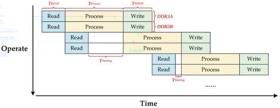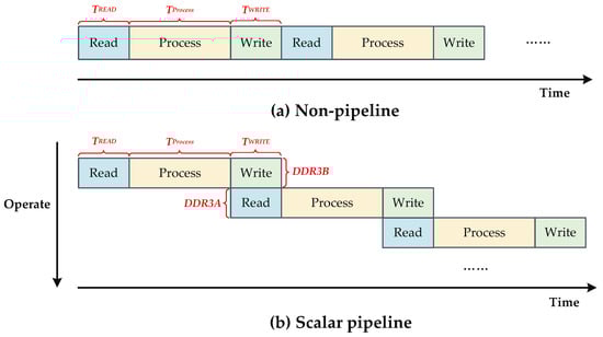 In the paper [35], the system pipeline is a scalar pipeline, that is, when data are accessed, the data are read from DDR3A and transmitted to the processing engine for processing. When the processed data are written into DDR3B, DDR3A reads the next data in the range direction or azimuth direction for processing. This operation is repeated many times, until all the data are processed. The time–space diagram of the scalar pipeline process during data access is shown in Figure 4. The above data-access process is transferred from DDR3A to DDR3B while DDR3B is read, and after processing, writing to DDR3A is similar. The scalar pipeline is more efficient than the no-pipeline design, but the long data processing time in the SAR imaging system causes the pipeline to generate a waiting or blocking state, which has an effect on real-time system processing.