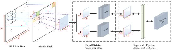 Enhancing the real-time imaging processing capability of massive data on satellite has become a technical requirement for spaceborne SAR due to the constrained resource environment on satellite. In the current SAR imaging system research, efficient data exchange and on-chip system architecture design are two of the key technologies. Various traditional SAR imaging algorithms regularly call for several exchange operations. Additionally, due to the limited storage bandwidth caused by the low exchange efficiency of massive data in traditional methods, computation and storage are not matched, which wastes computing power and influences the performance of real-time processing. In recent years, researchers have proposed a variety of methods to solve the problem of the limited storage access bandwidth of two-dimensional matrices, and implemented them on FPGA. A matrix block linear mapping was applied by Yang et al. [33] to improve data access bandwidth; however, the method has a low utilization of eight buffer RAMs and an imbalanced range and azimuth access efficiency. Sun et al. [34] balanced the range and azimuth accesses efficiency using a matrix block cross-mapping method. Wang et al. [35] used a dual-channel pipeline design to implement balanced two-dimensional access efficiency, higher buffer RAM utilization, and improved data exchange efficiency.