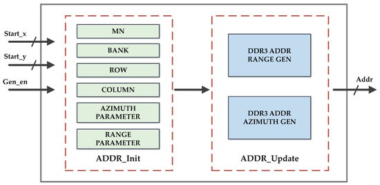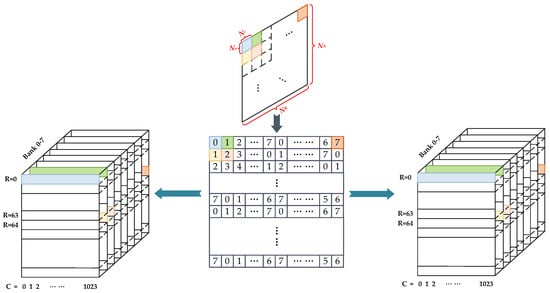 According to the mapping method proposed above, this section will describe the address mapping strategy that is used. Address mapping refers to the process of obtaining the physical storage address in DDR3 SDRAM for any given coordinate address within the SAR data matrix. The data points whose coordinates are in the two-dimensional data matrix can be explicitly distributed to the sub-matrix . Assume that the coordinates in this submatrix are . The relationship between and is as follows.