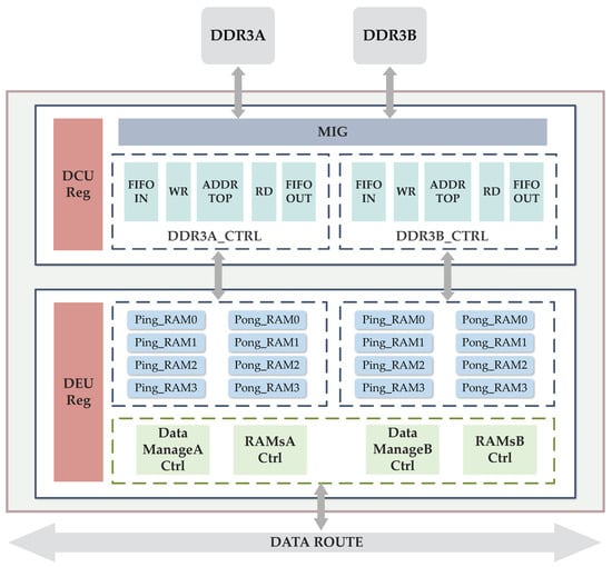 The superscalar architecture pipeline design is shown Figure 11; each DDR3 corresponds to a group of ping-pong RAM buffers, which can form a pipeline independently. Dual-channel DDR3 read and write operations can be executed concurrently through the design of the superscalar pipeline, meaning that read or write operations are performed on both DDR3A and DDR3B simultaneously, increasing the parallelism of data access. This method can result in greatly reduced idle latency in conventional pipelined or non-pipelined designs.