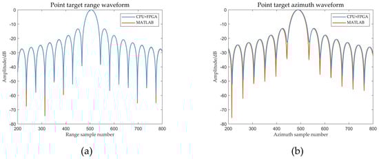 The waveforms of the SAR imaging results from the “CPU + FPGA” imaging system and MATLAB in the range and azimuth directions. (a) Range; (b) Azimuth.