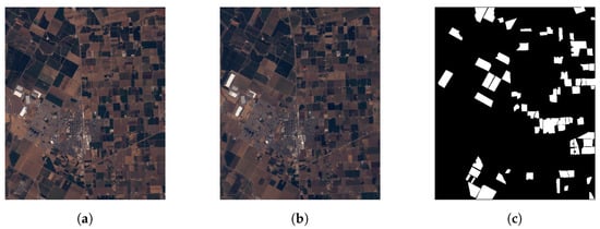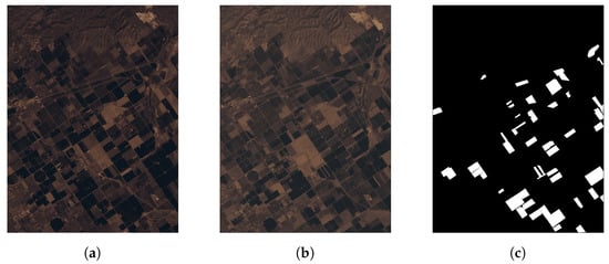Change detection dataset of Santa Barbara in Patterson city: (a) original image taken in 2013; (b) image with changes taken in 2014; (c) change reference information.