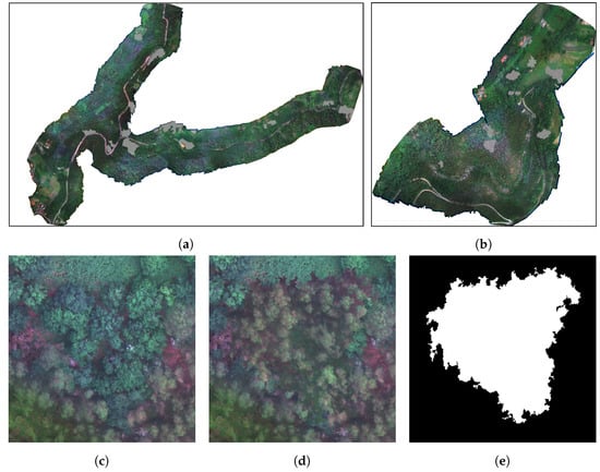 The UAV datasets were taken in 2018 with a MicaSense RedEdge-MX multispectral [] camera onboard at an altitude of 120 m. This camera captures five spectral bands corresponding to the following wavelengths of the electromagnetic spectrum of light: 475 nm (blue), 560 nm (green), 668 nm (red), 717 nm (red edge), and 842 nm (near-infrared). The VHR change detection datasets are shown in Figure 4a,b, including in grey the regions corresponding to changes. As usual, the vegetation changes do not correspond to isolated pixels, but to regions of the images. Figure 4c–e show a clipping of the images for the Oitaven dataset, illustrating an example of vegetation change.