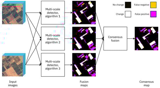 Several detection techniques based on the fusion of results from different methods, such as different object scales (multi-scale approach) [] or different algorithms (multi-algorithm approach) [], have been developed to take full advantage of the properties of spatial information extraction algorithms. Multi-scale and multi-algorithm techniques have one step in common: merging of results. The most-commonly used methods in the literature for this purpose are majority vote (MV) [], Dempster–Shafer (DS) [], or fuzzy integral (FI) []. Currently, most detection methods that use fusion techniques are based on deep learning and supervised detection. The main approach is to have several classifiers in parallel with the same objective, but to vary the parameters of the supervised learning [,,], for example using different convolutional neural networks (CNNs) differing in the convolutional filter size (e.g., 3 × 3, 5 × 5, and 7 × 7) in parallel and then fusing their results [,]. Another reported approach is to perform feature-based change detection using textures and morphological profiles at different scales []. There are also object-based multi-scale techniques where variability is achieved by varying the scale of each object using circular structures [] or segmentation algorithms []. Ensemble learning has also been used to perform fusion for change detection [,,] and is based on a combination of multiple classifiers to make a final decision, whereby the main objective is to minimise the errors of a single classifier by compensating them with other classifiers, resulting in a higher overall accuracy [].