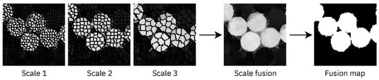 - Scale fusion: The techniques listed in Table 2 were used to merge the change intensity maps obtained after applying the same segmentation algorithm at different scales. Figure 9 shows an example of scale fusion for three scales of a Hermiston cropping, showing the difference map obtained after fusion and the subsequent thresholded map (fusion map in the figure).In the case of weighted fusion, a weight inversely proportional to the segment size was assigned to each difference map as shown in Equation (3), where indicates the weight of the map corresponding to the i-th scale segmentation. This implied that the smaller the segment size corresponding to a difference map, the higher the weight assigned to the map was.
