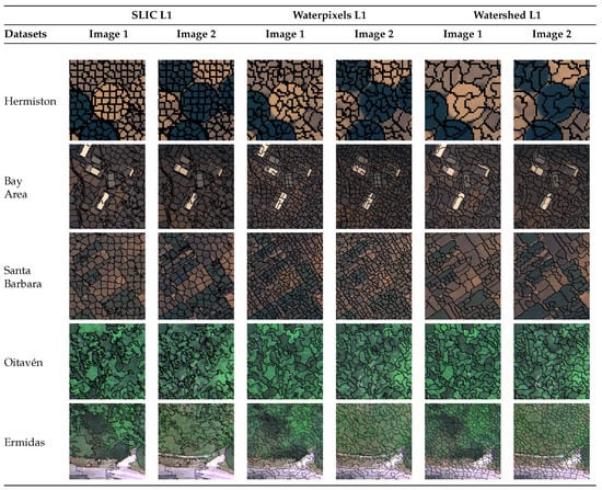 This section analyses the quality in terms of the accuracy of the proposed multi-scale approach based on consensus techniques and compares it using different configurations. The different metrics used to assess the quality of change detection are described in Section 2.3. Table 4 shows the results obtained by the proposed change detection (CD) method in terms of CP or recall using three levels of segmentation for each of the three segmentation algorithms. The results for all of the intermediate phases are also shown. This table shows the accuracy of every single level of segmentation (single scale) after merging several levels with the five different fusion algorithms described in Section 2 (Columns 5–9) and, finally, after merging the results of each multi-scale segmentation using two consensus techniques (last two columns in the table). The colour code from dark red to dark green made it easy to observe that the worst results were obtained using a single-scale technique. Multi-scale fusion yielded better quality results, particularly with the fusion based on the Euclidean distance (ED) for all of the datasets. The ED detected more changes at the cost of some erroneous detection, as mentioned in the previous section. Finally, the best results were obtained by performing consensus fusion: merging the results of each ED multi-scale fusion, in particular with the OR fusion technique. These results confirmed the effectiveness of the proposed method with the ED, multi-scale fusion, and OR consensus fusion, obtaining accuracies exceeding 94% in both VHR and low- or medium-resolution datasets. Figure 11 presents the croppings of the Level-1 segmentation maps generated for each dataset using SLIC and waterpixels, showing that, for the same image (one row of the figure), the three different segmentation algorithms provided different spatial information even when the same average size for the segment was used for all.