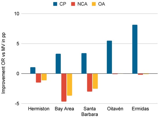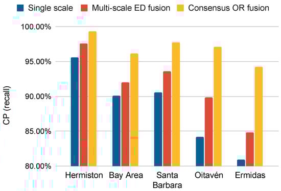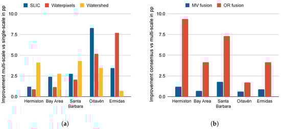 In addition, as segmentation is not a well-defined problem and VHR images present richer spatial information, different segmentation algorithms were proposed, and their results were combined using consensus techniques. Therefore, it was necessary to test the hypothesis that a consensus-based fusion among segmentation algorithms improved the accuracy of the multi-scale version with only one segmentation algorithm. To answer this question, Figure 12b shows the improvements in CP using the consensus technique approach over the use of a single multi-scale segmentation algorithm, with improvements obtained for all of the datasets obtaining the highest results in the case of the OR fusion technique. This improvement was, as expected, particularly high for the VHR datasets, i.e., an average improvement of +5.33 percentage points (pp) and, specifically, an average improvement of +8.33 points for the two VHR datasets (Oitaven and Ermidas).